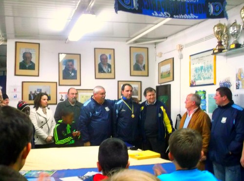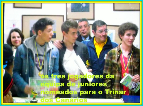 O Trinar dos Canários,a nivel de treinador foi atribuido a Tiago Morais, treinador da equipa de seniores e coodenador das escolas de formação, aqui o vemos ao centro ladeado pelos dois outros indigitados os técnicos José Beleza, treinador da equipa de juniores e Paulo Canhola. Prémio que foi entregue por Reporter Ocasião,à direita na imagem. De referir que tanto o presidente da Assembleia Municipal de Almada, José Manuel Maia, bem como o vereador António Matos, nas suas intervenções fizeram alusão aos seus trabalhos, reportagem publicados no RO.