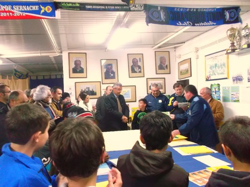 Imagem final da sessão solene do Charneca de Caparica Futebol Clube, com dois reforços de peso o vereador António Matos e a presidente da Junta, Margarida Luna de Carvalho, ostentanto os cachecóis com que foram brindados. Seguiu-se depois um beberete onde não faltou o tradicional bolo aniversariante.